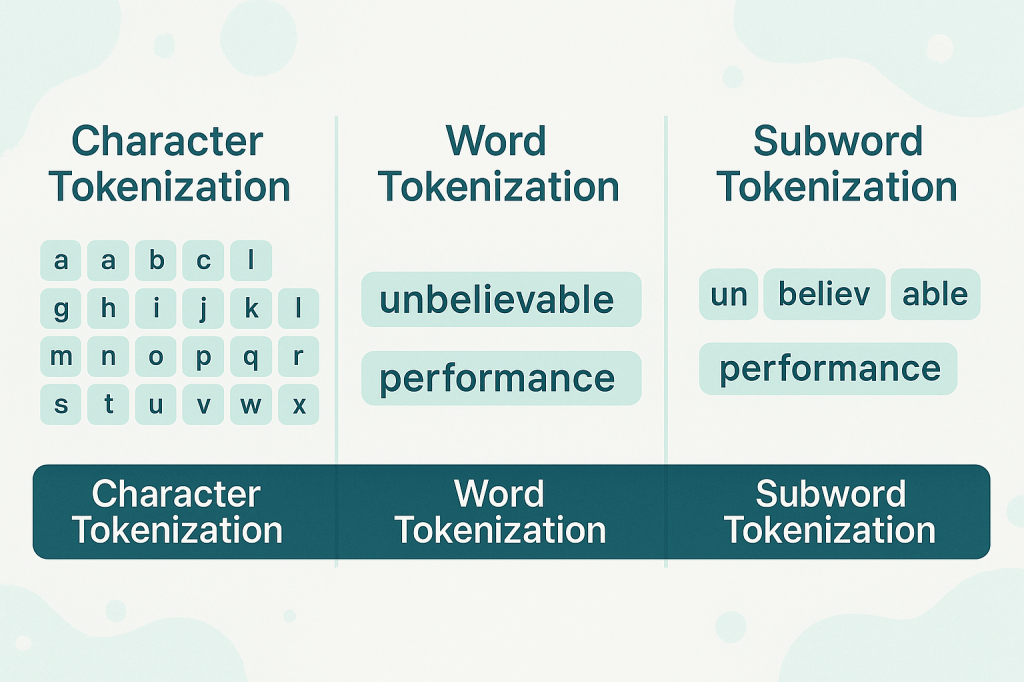 - 字元級(Character):每個字母和空白都是一個 token。它能處理任何輸入,但 token 數大幅增加,效率低下。